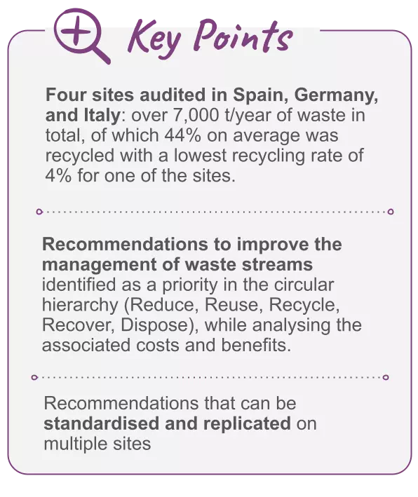 - conducting site visits to understand the production processes and waste stream management, assess upstream and downstream stakeholders, and identify opportunities for improvement in waste management;