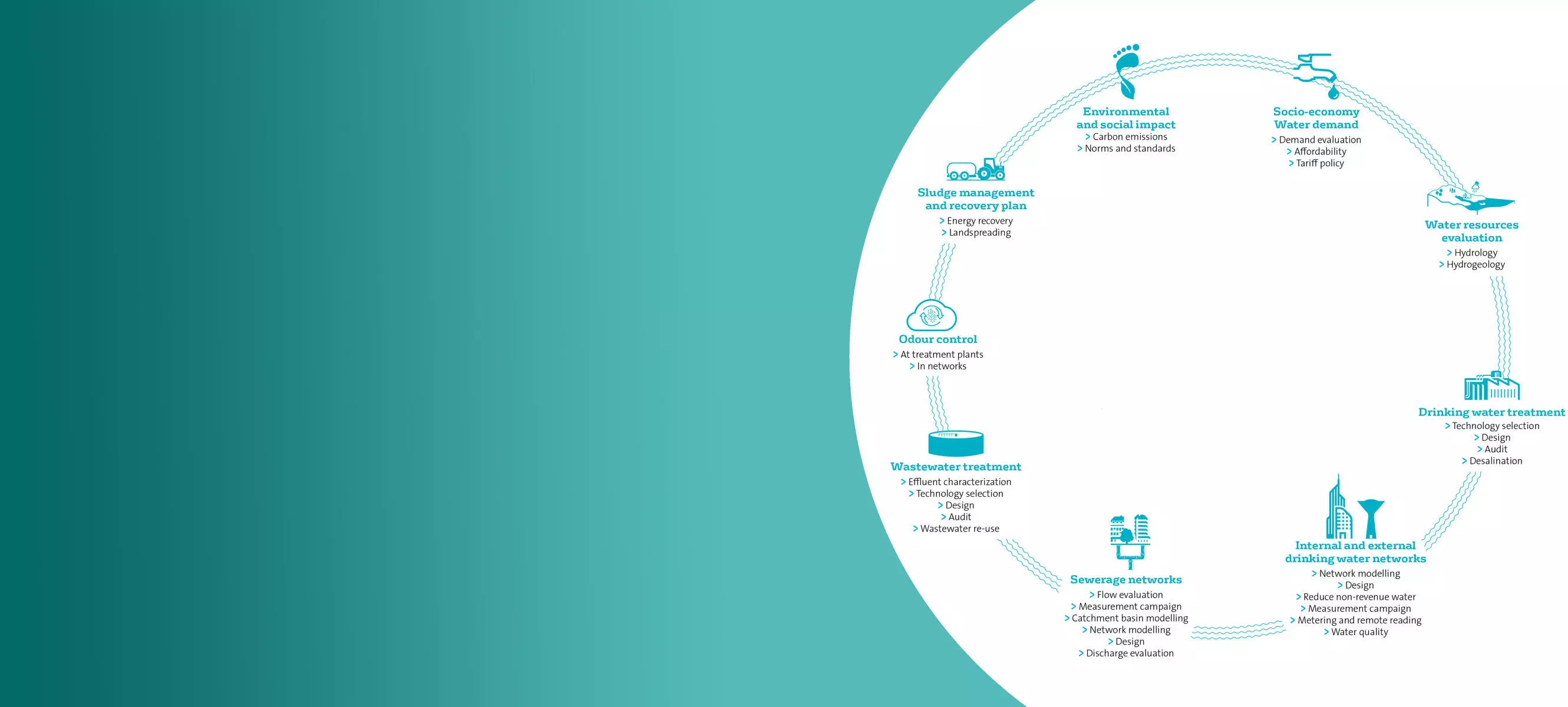 Water is both a natural resource essential to life, an integral part of the development of our territories, a source of energy production and storage but also a possible risk for populations. Our experts intervene at each stage of the water cycle, with the sole objective of improving the performance of our customers in a sustainable manner while respecting the environment.