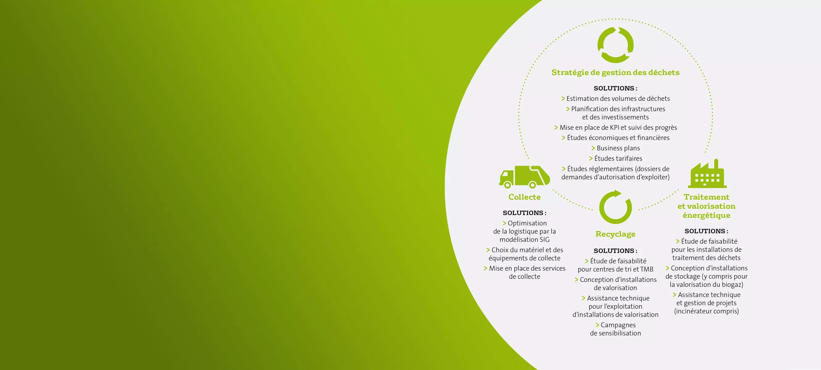 C’est pour accompagner nos clients dans cette démarche que nous avons développé une expertise solide dans les stratégies des services de gestion des déchets, et propose une assistance à la planification, à la gestion, au suivi des progrès et à l’évaluation de la performance, avec pour objectif d’améliorer constamment le service.