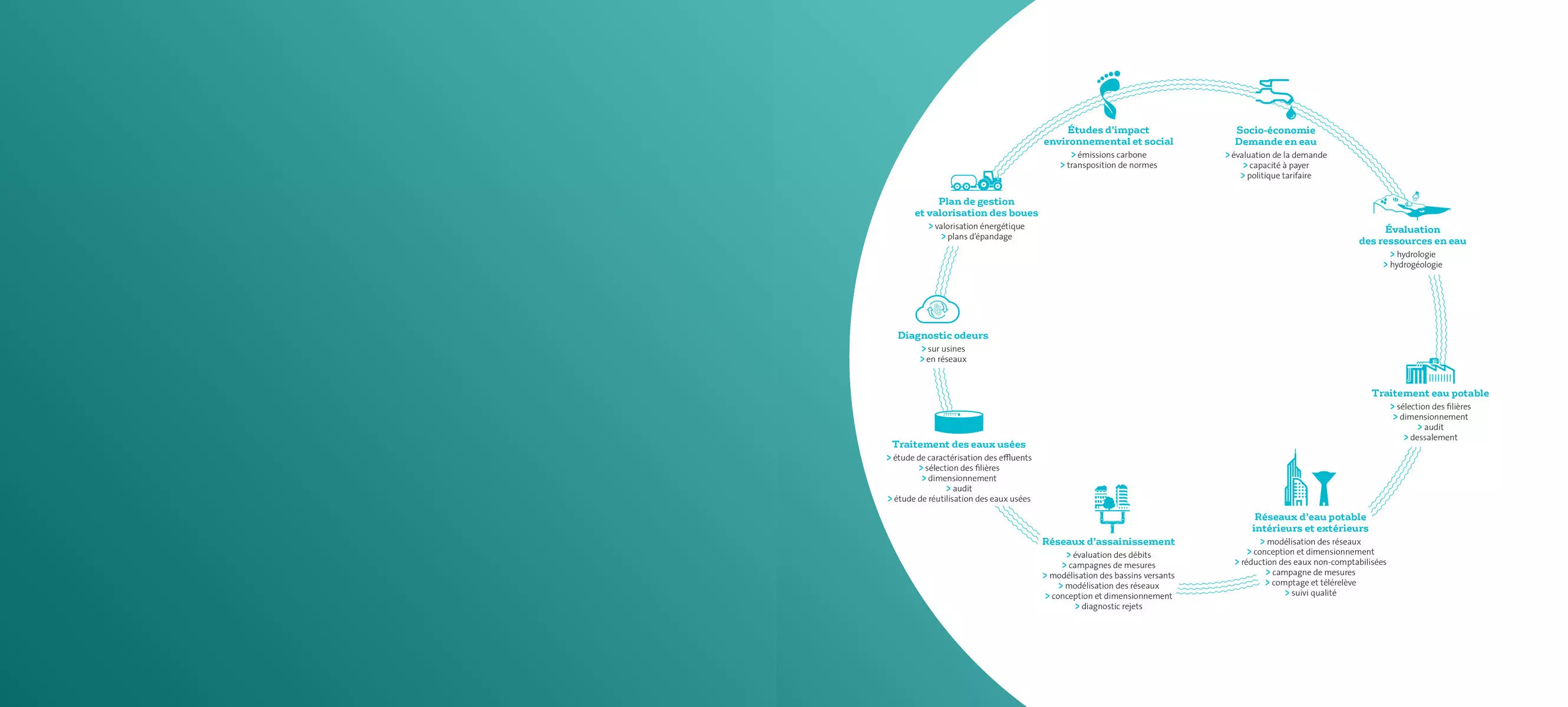 L’eau est à la fois une ressource naturelle indispensable à la vie, une partie intégrante dans l’aménagement de nos territoires, une source de production et de stockage d’énergie mais aussi un risque éventuel pour les populations. Nos experts interviennent lors de chaque étape du cycle de l’eau, avec pour seul objectif d’améliorer durablement la performance de nos clients dans le respect de l’environnement.