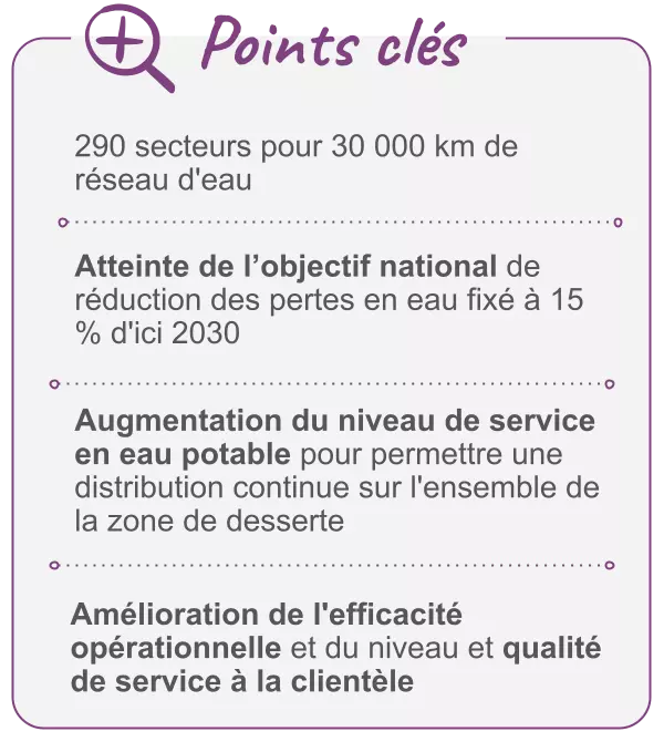 - la sectorisation du système de distribution d’eau potable, comprenant 290 secteurs pour les 30 000 km de réseaux, afin de permettre une exploitation efficace et d’améliorer le rendement du réseau ;