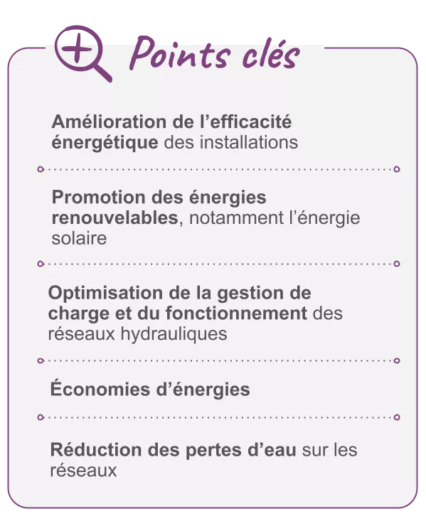 - la mise en oeuvre des options d’énergie renouvelable (potentiels de production d’énergie dans les stations d’épuration ou les réseaux gravitaires ou encore solaire photovoltaïque)