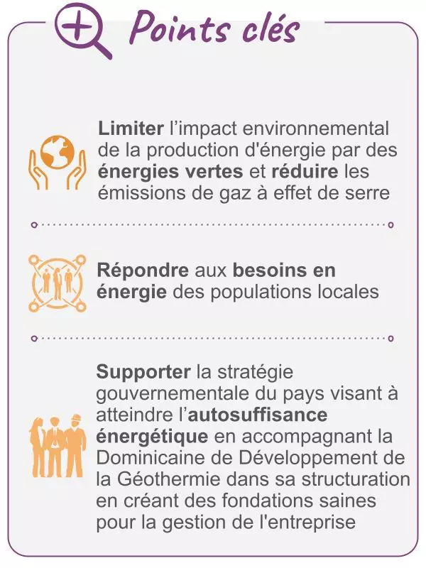 Le gouvernement de la Dominique (GoCD) a défini une politique visant à atteindre l'autosuffisance énergétique du pays d'ici 2020. Pour atteindre cet objectif, le gouvernement est prêt à exploiter les ressources géothermiques de l'île pour générer de l'électricité et répondre aux besoins énergétiques de la population tout en veillant à garder des coûts énergétiques compétitifs, limitant l'impact sur l'environnement local et réduisant les émissions de gaz à effet de serre.