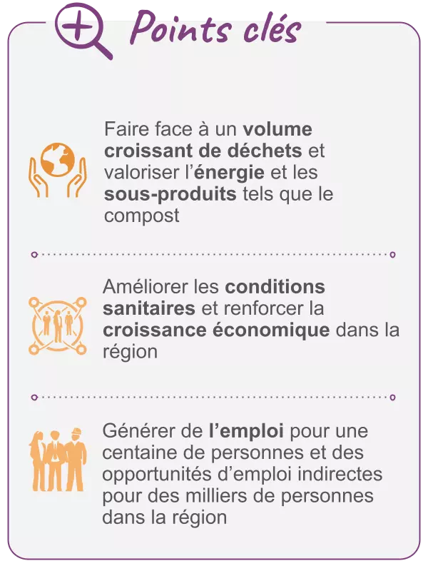 L’installation traite 600 tonnes par jour de déchets solides municipaux. Sa capacité de production d’énergie est de 9 MW.